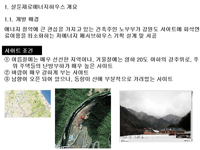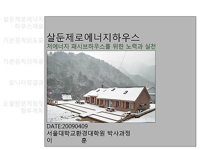 업데이트가 너무 늦어 살둔제로에너지하우스 관련 발표자료 초안의 일부를 우선 옮겨봅니다. 늦은 업데이트에도 찾아와 주시는 모든 분들께 진심으로 감사드립니다. 노력과 실천으로 이루어진 살둔제로에너지하우스 입니다. 노력의 많은 부분을 먼저 해보았고 모두 공짜로 아낌없이 공유하려하니, 많은 분들이 실천에 옮기시길 희망합니다. 꿈꾸시는 일반 건축주분들이나 희망하시는 건축사 및 시공관련 분들이 자신감을 가지고 배우고 실천하시기를 기원합니다. 화이팅 입니다.